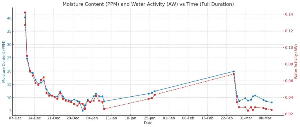 📉 Moisture (PPM) and Water Activity (AW) showed a sharp initial drop